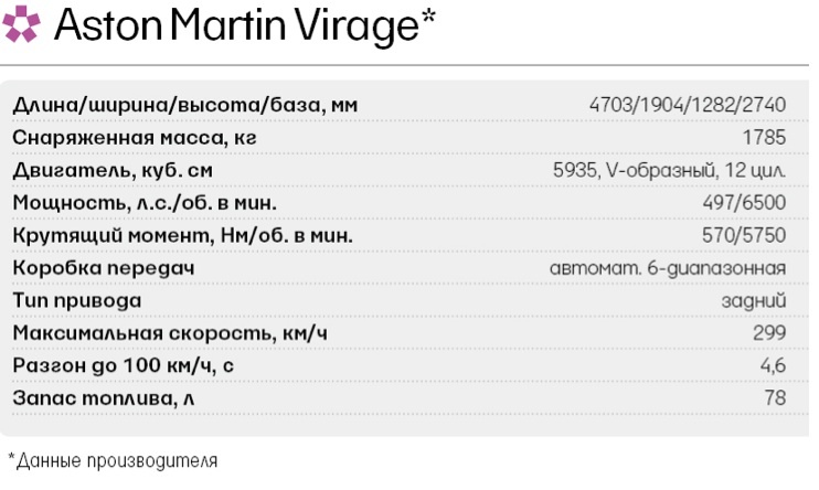 Испытывать Virage мы отправились на гоночный трек. На первых трех кругах моему восторгу не было предела. 500-сильный шестилитровый мотор V12 выдавал 570 Нм крутящего момента (и заодно радовал великолепным рыком), новый шестидиапазонный автомат Touchtronic 2 четким переключением и честной работой в ручном режиме обеспечивал предельные обороты на каждой передаче. Эффективно остудить пыл Virage помогали керамические (представлены в базовой комплектации) тормоза — шести- и четырехпоршневые спереди и сзади соответственно. Здесь даже новые настройки системы стабилизации, ограничивающие возможности водителя похулиганить тремя степенями вплоть до полного отключения. C места до 100 км/ч новая машина разгоняется всего за 4,6 секунды, ее максимальная скорость — 300 км/ч. Для сравнения я решил проехать пару кругов на менее мощном, но более легком Aston Martin Vantage S. И был разочарован — по сравнению с ним, в поворотах и на разгоне более тяжелый и габаритный Virage оказался в заметном проигрыше: не спасла ни новая адаптивная подвеска ADS, ни волшебный спортивный режим, активирующийся кнопкой Sport Mode и делающий автомобиль более отзывчивым на газ и острым в управлении.