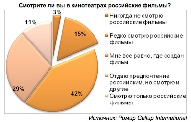Соответствующий опрос был проведен среди полутора тысяч жителей российских городов в возрасте от 18 до 60 лет накануне Дня российского кино, который традиционно отмечается 27 августа. Полученные данные подтверждаются данными кинопроката первой половины 2011 г., по результатам которых посещаемость российских фильмов по сравнению с аналогичным периодом 2010 г. упала на треть.