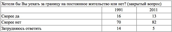 Доля россиян, желающих покинуть страну, за последние 20 лет уменьшилось, утверждают специалисты ВЦИОМ, в очередной раз опросив 10-11 сентября 1600 человек в 138 населенных пунктах в 46 областях, краях и республиках России. На вопрос "Хотели бы вы уехать за границу на постоянное место жительства?" утвердительно ответили 13%, тогда как в 1991 г. - 16%. Не желают покидать страну сегодня 82% наших соотечественников, тогда как 20 лет назад таковых насчитали 70% (см. таблицу).