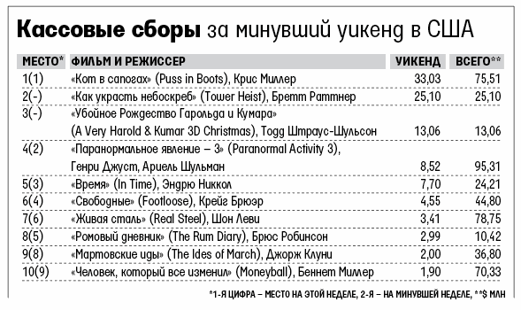 Комедийный боевик «Как украсть небоскреб», сдвинувший «Паранормальное явление» со второй строчки, заработал $25,1 млн. Другие комедии с участием Бена Стиллера и Эдди Мерфи собирали больше: результат первого уикенда «Знакомства с родителями» (Стиллер) – $28,6 млн, а «Уловки Норбита» (Мерфи) – $34,2 млн. Действие нового фильма разворачивается в манхэттенской башне Трампа, где живет капиталист, у которого обманутые рабочие пытаются согласно заветам классиков марксизма экспроприировать неправедно нажитое состояние.