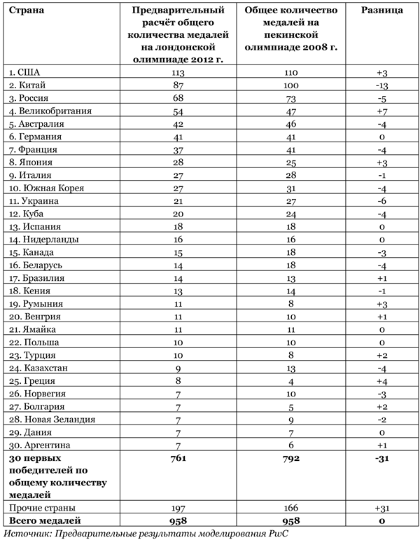 Аналитики PricewaterhouseCoopers (PwC) сходятся в оценках с букмекерами (соответствующий прогноз обнародован в понедельник). По оценкам PwC, Россия завоюет в Лондоне в общей сложности 68 медалей и станет третьей в общем командном зачете, тогда как лидером будет команда США со 113 наградами, а второе место, как и в прошлый раз, достанется Китаю - 87 медалей. Замкнут пятерку лидеров Великобритания и Австралия (подробности смотрите в таблице).