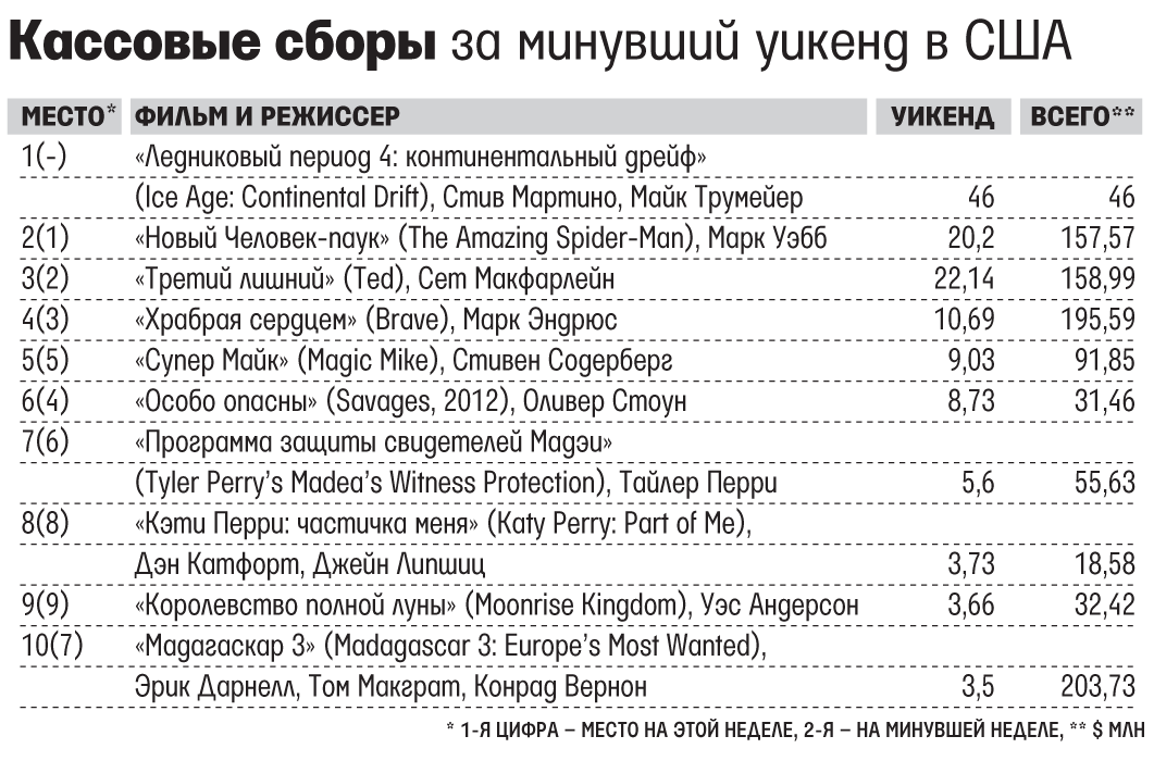 Новая серия «Ледникового периода» забралась на вершину прокатной десятки не так шустро, как предыдущие анимационные блокбастеры этого года. Результат первых выходных – всего $46 млн. У «Лоракса» было $70,2 млн, у «Храброй сердцем» – $66,3 млн. И даже у «Мадагаскара 3» – $60,3 млн, но он был все-таки третьим, а «Ледниковый период» уже четвертый. Сколько, в конце концов, можно радоваться шуткам про саблезубую белку. Сериал пришел к тому, с чего начинал: самый первый «Ледниковый период» заработал на старте практически ту же сумму. Вторая и третья части были заметно успешнее. Но аналитики считают, что доисторические звери выступили неплохо и падение интереса к их приключениям – в пределах нормы: вот, для сравнения, и последний «Шрек» на старте тоже уступил предпоследнему 42% сборов. Все равно ведь первое место занято, и «Новый Человек-паук» сдвинут на вторую позицию. Хотя тоже держится молодцом: сборы по сравнению с первым уикендом упали на 44%, для экранизации комикса это хорошо и свидетельствует о доброй молве, которую распространяют о Человеке-пауке те, кто уже посмотрели, насколько он новый и изумительный (amazing – как в оригинальном названии). А за третье место крепко уцепился плюшевый медведь из комедии для взрослых «Третий лишний». Должно же быть в этой таблице хоть что-то для взрослых.