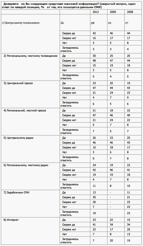 Интернет в качестве источника информации всерьез рассматривают 59% россиян, а доверяют - 64%. При этом рост доверия интернету (на 15 п.п.) - самый высокий: в 2008 г. интернет-публикациям доверяли лишь 49% респондентов. Для сравнения: ЦТ в 2008 г. доверяли 71% россиян (на 7 п.п. меньше, чем сейчас), региональному телевидению - 69% (на 9 п.п. меньше), центральной прессе - 62% (на 8 п.п. меньше), региональной прессе - 62% (на 8 п.п. меньше), центральному радио - 68% (на 4 п.п. меньше), региональному радио - 63% (на 3 п.п.), зарубежным СМИ - 32% (на 11 п.п. меньше).
