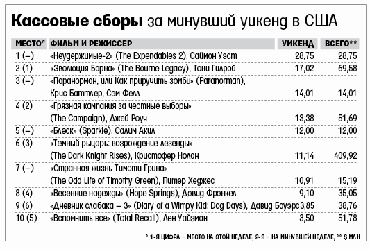 На первой строчке – ностальгический боевик «Неудержимые-2», собравший на одной площадке всех крутых парней из 80-х и 90-х от Брюса Уиллиса до Арнольда Шварценеггера. Фильм по сценарию Сильвестра Сталлоне заработал на родине $28,75 млн, что на 17% меньше, чем оригинал 2010 г. ($34,8 млн). Приманками могли бы стать Жан-Клод Ван Дамм в роли злодея и винтажный техасский рейнджер Чак Норрис, но ни на того, ни на другого не был сделан упор в рекламной кампании. Скромные финансовые показатели могут затруднить производство уже заявленного продолжения «Неудержимые-3» с Николасом Кейджем. Однако ситуацию спасают зарубежные сборы.