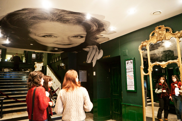 В гардеробе «Школы современной пьесы» зеркала в старинном духе, а на потолке портреты актеров