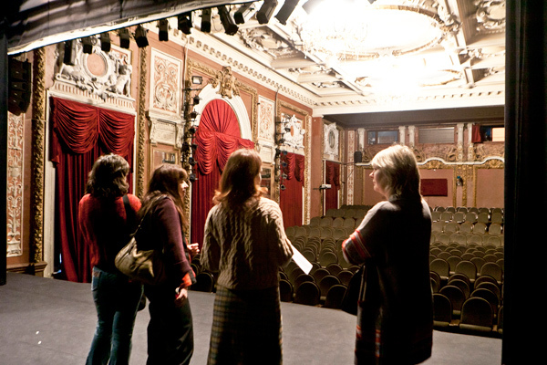 Я и две молодые женщины, Татьяна и Лариса, стоим в пустом зрительном зале театра «Школа современной пьесы», где в XIX веке находился знаменитый ресторан «Эрмитаж», а после революции – Дом крестьянина, и слушаем рассказ PR-менеджера Раисы Матряшиной. Зал, с 1989 года принадлежащий «Школе современной пьесы», красив: лепнина, огромные зеркала, красные портьеры. Раиса рассказывает о том, как в Татьянин день ресторан «Эрмитаж» отдавали на откуп гуляющему студенчеству. А потом обращает наше внимание на маленькую ложу – на ее месте раньше находилась эстрада, с которой пел Шаляпин – так, что, по легенде, трескались хрустальные подвески люстр. Мы, как по команде, поднимаем глаза к потолку. «Ну, вряд ли это те же самые люстры!» – говорит Раиса.