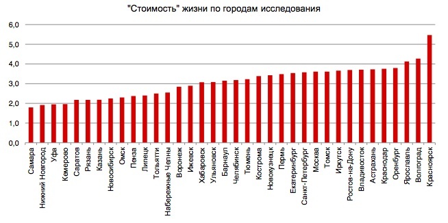 Среди городов, где проводилось исследование, наибольшая оценка «стоимости» жизни отмечена в Красноярске (5,5 млн руб.), Волгограде (4,3 млн) и Ярославле (4,1 млн). Самая низкая - в Самаре (1,8 млн), Нижнем Новгороде и Уфе (1,9 млн). Для сравнения, в Санкт-Петербурге - 3,5 млн, а в Москве - 3,6 млн. Зубец считает, что подобные представления в различных городах связаны с представлениями жителей о степени опасности производств региона и возможностях работодателей.