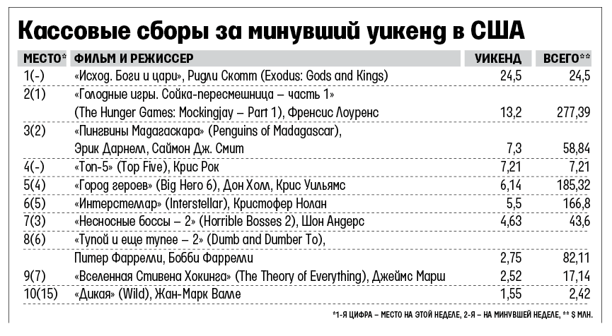 Перемены в остальной части прокатной таблицы незначительны: с первого на второе место съехали наконец-то «Голодные игры. Сойка-пересмешница», со второго на третье - «Пингвины Мадагаскара». И лишь на четвертое вклинилась новинка - комедия Криса Рока «Топ-5» с ним же в главной роли ($7,2 млн). Чуть интереснее в самом конце десятки: расширив прокат до 166 кинотеатров, сюда пробралась «Дикая» - основанная на реальной истории драма о бывшей наркоманке, которая, чтобы вернуться к нормальной жизни, прошла пешком по горам около 2000 км. Сыграла героиню и спродюсировала фильм Риз Уизерспун, и поздравлять с $1,55 млн сборов надо прежде всего ее. Окрыленная успехом студия Fox Searchlight уже заявила, что к концу недели поднимет количество кинотеатров как минимум до 850.