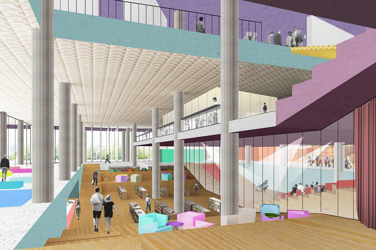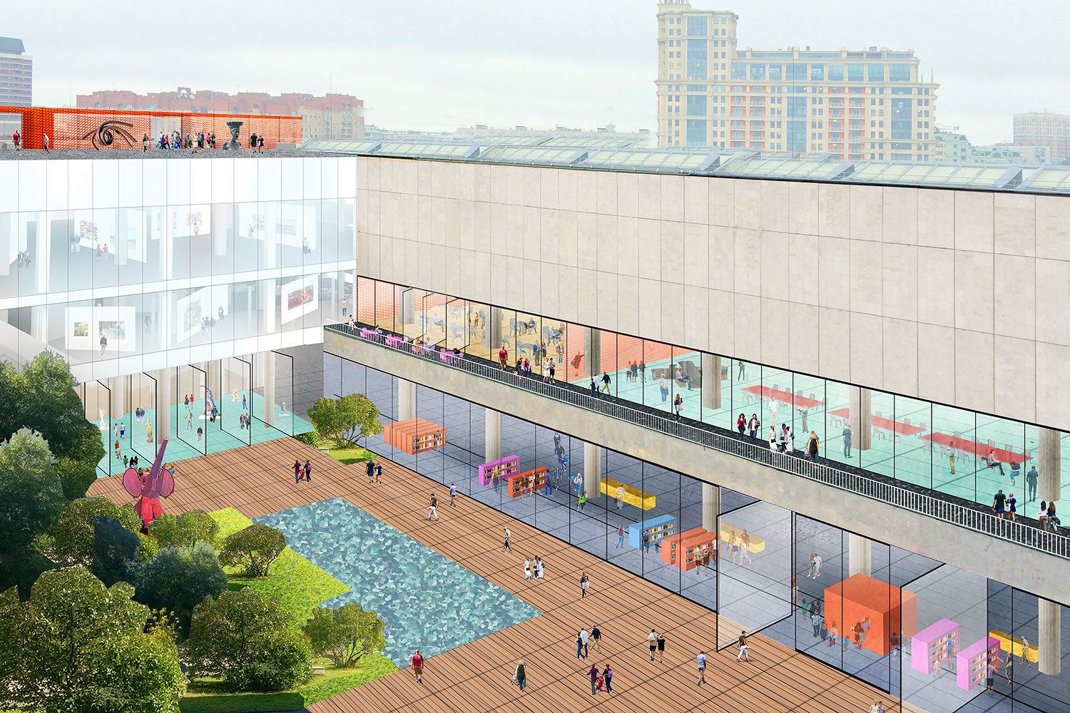 Единое внутренне пространство предполагается разделить на четыре зоны – хранилища, постоянной экспозиции и выставок, образовательную (с аудиториями, библиотекой и кинозалом) и фестивальную – для проведения различных мероприятий, там же будет ресторан