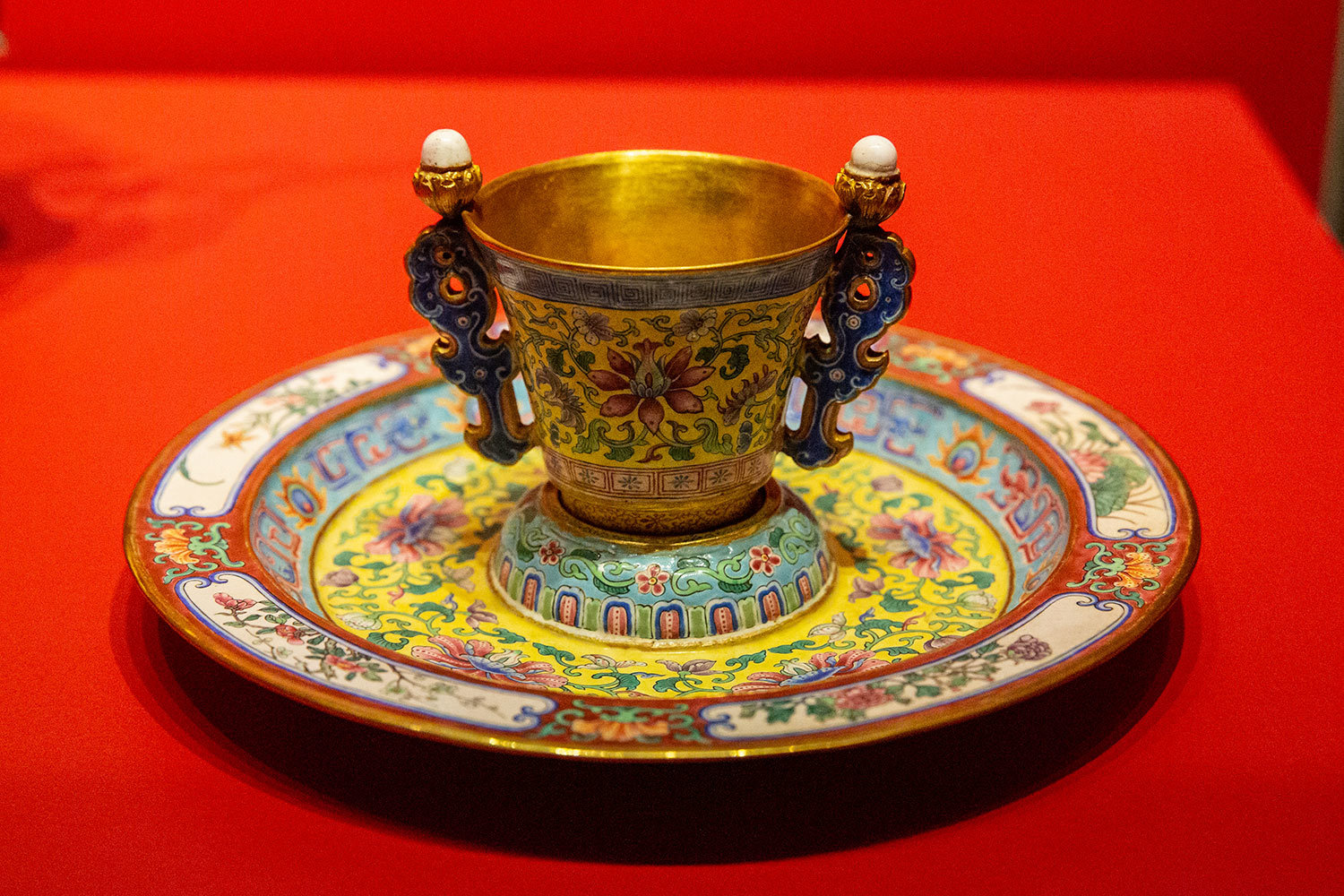 Чашка и блюдце: золото, жемчуг, расписная эмаль