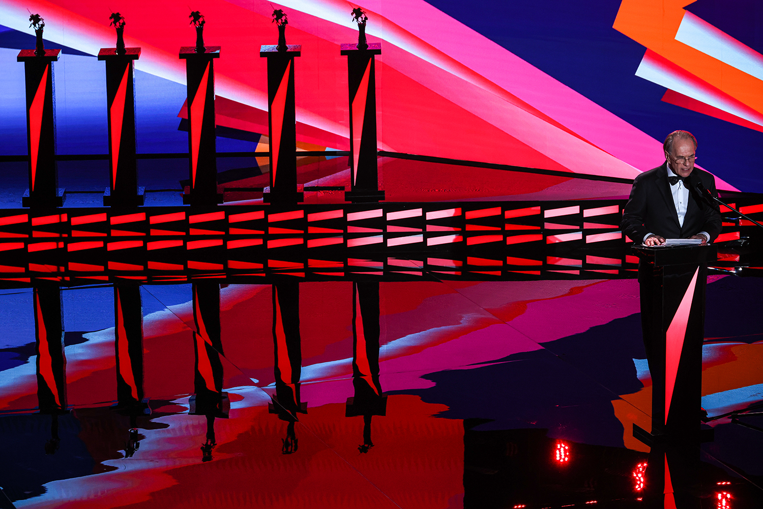 На фото: президент Московского международного кинофестиваля Никита Михалков (слева) и председатель жюри Луис Миньярро на церемонии открытия 47-го ММКФ.
