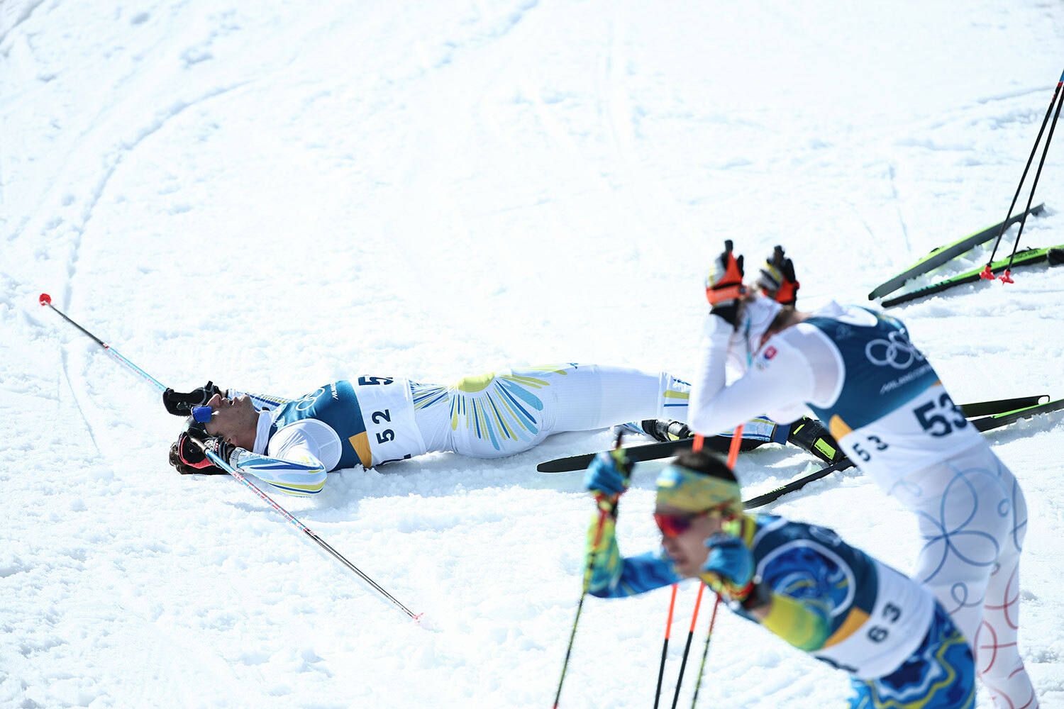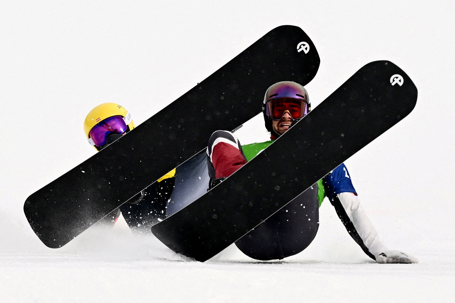Большой финал в дисциплине «сноуборд-кросс»: канадец Элиот Грондин и австриец Якоб Дусек сразу после финиша.