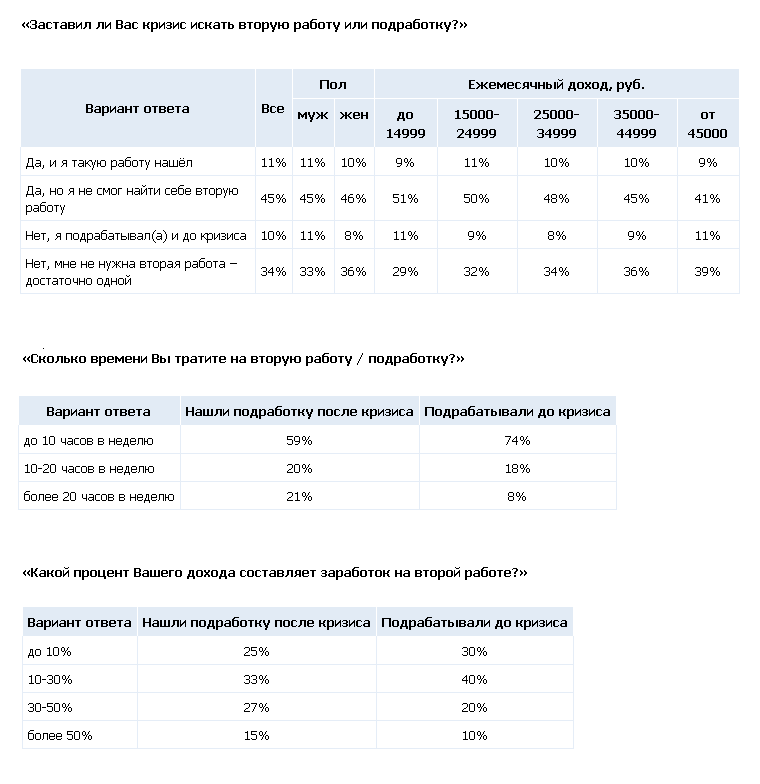 Каждый десятый опрошенный (10%) признался, что подрабатывал еще до начала экономического спада. 11% респондентов нашли подработку в период кризиса. По наблюдениям исследователей, успех в поиске второй работы практически не зависит от уровня дохода: и среди тех, кто зарабатывает до 15 000 руб. в месяц, и среди тех, кто получает более 45 000 руб., подработку во время кризиса нашли 9-11% респондентов. Хотели бы иметь вторую работу, но пока не нашли подходящий вариант, 45% работающих сограждан.