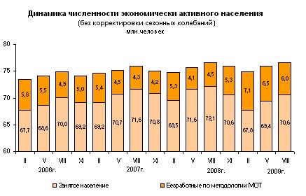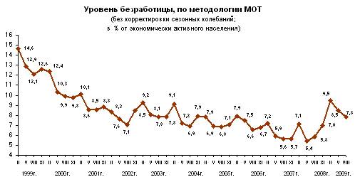 В сентябре Минэкономразвития прогнозировало среднегодовой уровень общей безработицы в 2009 г. в 6,8 млн человек, а регистрируемой – в 2,2 млн. Глава Роструда Юрий Герций предполагал, что регистрируемая безработица в силу сезонного фактора осенью начнет расти и к концу года достигнет 2,5 млн человек.