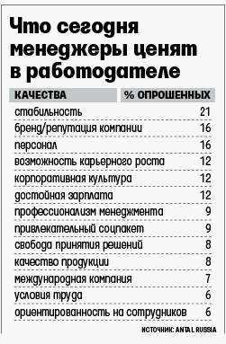 Рекрутинговая компания Antal Russia в октябре подвела итоги опроса 200 специалистов, менеджеров среднего и высшего звена, 66% из них работают в иностранных, 41% – в крупных компаниях (со штатом более 500 человек). «Это люди, имеющие хорошую работу, но готовые рассматривать новые предложения», – объясняет Елена Бирюкова, руководитель HR-департамента Antal Russia. Выяснилось, что 21% участников опроса больше всего ценят работодателя за стабильность, 12% – за возможность карьерного роста и столько же – за достойную зарплату. Под стабильностью респонденты понимают финансовую устойчивость бизнеса, независимость его от банковских кредитов, возможность реализовывать проекты в кризис, стабильные объемы продаж, объясняет Бирюкова. На собеседованиях менеджеры в первую очередь спрашивают, готова ли компания сохранить существующие темпы развития. «Например, все претенденты на должность директора по персоналу для открывающегося российского представительства западной компании задавали экономические вопросы: сколько работодатель собирается инвестировать в новый офис, каков бюджет для России и стратегия развития, – уточняет Бирюкова. – Кандидатам, дошедшим до финального интервью, компания показала все цифры».