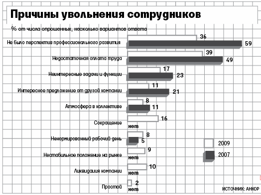 По данным «Анкора», на 23% снизилось число тех, кто ушел с работы из-за отсутствия перспектив в компании, на 10% уменьшилось количество тех, кого не устроила зарплата. 16% опрошенных ушли по сокращению, 10% – из-за ликвидации компании.