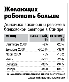 В октябре – ноябре банки в Самарской области активно начали набирать сотрудников, говорят представители кадровых агентств и рекрутинговых сайтов. По данным SuperJob.ru, за октябрь – ноябрь количество вакансий увеличилось на 36,8% и 11,5% соответственно. Сейчас банковских вакансий на 30% больше, чем в декабре 2008 г., отмечают президент рекрутингового портала SuperJob.ru Алексей Захаров и консультант по подбору персонала кадрового холдинга «Анкор» Мария Царева.