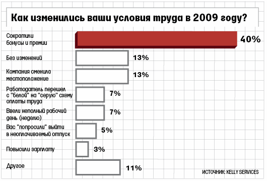 Но не всем так повезло. На вопрос о том, какие составляющие соцпакета претерпели изменения в вашей компании в 2009 г., лишь 17% респондентов ответили, что у них ничего не изменилось. Остальные не скупились на комментарии: одним в течение какого-то времени вообще не платили зарплату, другим сократили дотации на обеды и перестали оплачивать сверхурочные, третьи жаловались на отмену льгот на фитнес и курсы иностранного языка, четвертые – на то, что им перестали выдавать денежные премии по праздникам (Новый год, 8 Марта и 23 февраля) и дарить подарки на свадьбы и рождение детей.