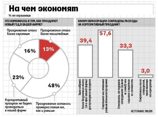 В прошлом году все замерли перед надвигающейся угрозой сильного падения рынка – и отменялись даже подписанные соглашения на проведение мероприятий, рассказывает гендиректор агентства Tomato Momentum Екатерина Бокова. «Популярные площадки, которые в 2007 г. были заняты на все дни декабря, в конце 2008 г. имели 1–2 заполненных дня, – говорит она. – В этом году ситуация выправляется: клиенты примерно понимают финансовые результаты года и готовы потратить некоторую часть денег на новогодние мероприятия». Причем для многих праздник является частью мотивационной программы – благодарностью сотрудникам за работу в этом непростом году.
