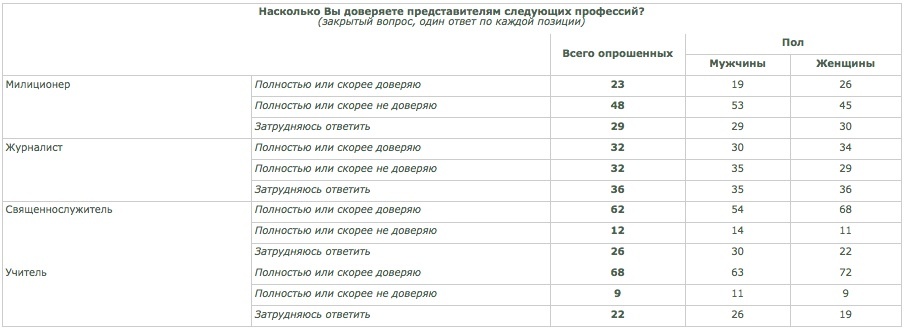 В целом доверять кому бы то ни было более склонны женщины, чем мужчины. Так, они отдают предпочтение учителям (72% против 63% среди мужчин), священнослужителям (68% против 54% соответственно), журналистам (34% против 30%), милиционерам (26% против 19%).