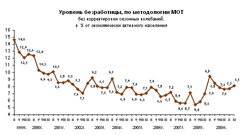 По данным Росстата, общая безработица в России растет с сентября, и в ноябре 2009 г. составила 6,1 млн человек, или 8,1% экономически активного населения (в соответствии с методологией Международной организации труда). Впрочем, российской безработице далеко до европейской и американской. Уровень общей безработицы в 16 странах зоны евро, по данным Eurostat, в ноябре вырос до 10% (до 15,712 млн). Причем европейская безработица практически сравнялась с американской, где в ноябре она снизилась с 10,2% до 10%. По новым данным министерства труда США, в декабре американская безработица снизилась на 73 000 до 15,267 млн человек (те же 10%).