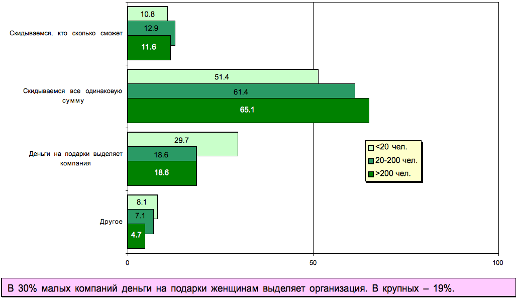 Согласно результатам интернет-опроса MASMI Russia, в 95% средних и крупных компаний (свыше 200 сотрудников) празднование 8 Марта – давняя традиция, в то время как лишь в 62% небольших компаний принято проводить корпоративы. Однако в малом бизнесе подарки дамам чаще оплачиваются из корпоративного бюджета, а в крупном – из средств служащих-мужчин (см. график № 2).