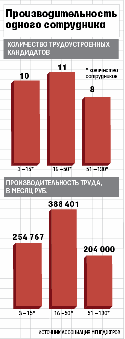 В прошлом году в холдинге «Анкор» выручка на одного специалиста по подбору средних менеджеров составляла примерно 300 000 руб., а вот у специалистов по топ-менеджменту показатель мог быть и больше 1 млн руб., замечает Татьяна Баскина, директор по рекрутменту холдинга. В компании Kelly Services среди сотрудников, работающих с топовыми позициями, эффективным считался тот, кто приносил 600 000 руб. в месяц, говорит директор по продажам Наталья Курантова. Но с показателем средней производительности по подбору рядовых сотрудников и среднего менеджмента она согласилась. «У многих компаний гонорары по подбору руководителей высшего звена упали меньше всего, а по самым низким позициям заметно уменьшились», – добавляет Баскина.