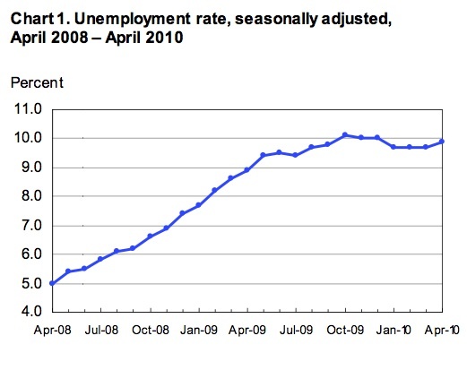 В апреле общая безработица в США выросла с 15,005 млн до 15,26 млн человек, при этом доля безработных впервые за три месяца увеличилась с 9,7 до 9,9% экономически активного населения, сообщает министерство труда США. Своего рекордного (за 26 лет) уровня в 10,2% американская безработица достигла в октябре прошлого года, затем следовало незначительное снижение (см. график).
