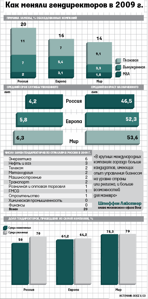 В 2009 г. каждая пятая крупная российская компания поменяла гендиректора. Средний гендиректор в России моложе, чем в Европе, он отправляется в отставку быстрее и по причинам, которые не связаны с финансовыми результатами компании