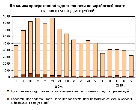 Объем просроченной задолженности по зарплате на 1 мая 2010 г. составил 1% месячного фонда заработной платы; в сельском хозяйстве - 2%.