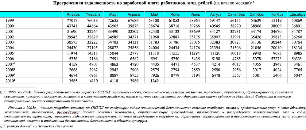 На 1 мая 2010 г., по сведениям организаций (не относящихся к субъектам малого предпринимательства), суммарная задолженность по зарплате по составила 3,24 млрд руб. и снизилась по сравнению с 1 апреля 2010 г. на 725 млн руб. (на 18,3%), сообщает Росстат (см. график), Это самый низкий показатель с октября 2008 г. (4,024 млрд руб. на 1.11.2008).