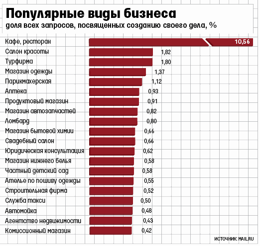 По данным анализа более 300 000 запросов, наибольшую активность проявляют люди в возрасте 19–25 лет, причем чаще всего вопросами создания бизнеса интересуются девушки (58,77% от общего количества запросов по теме). По подсчетам аналитиков портала, наиболее часто предметом запросов становится открытие своего кафе или ресторана – обзавестись собственным общепитом хочет каждый десятый из рвущихся в бизнесмены. Второе и третье место по популярности удерживают салон красоты, туристическая фирма, магазин по продаже одежды и аптека. Мужчины интересуются вопросами открытия магазина автозапчастей, автомойки или юридической консультации.