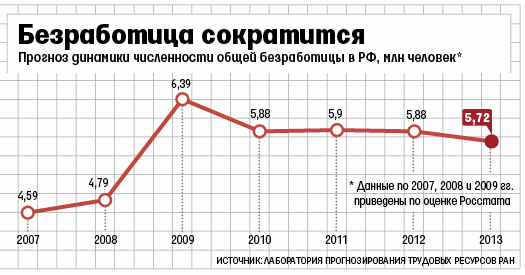 Вчера правительство России утвердило новый сценарий социально-экономического развития страны на ближайшие три года. По словам человека, располагающего рабочими материалами документа, в очередной раз был понижен прогноз по безработице на 2010 г. с 6,3 млн (декабрьский прогноз) до 6 млн человек. В министерстве опровергать информацию не стали. Как сообщил «Ведомостям» завлабораторией прогнозирования трудовых ресурсов РАН Андрей Коровкин, по расчетам его ведомства, безработица может снизиться до 5,88 млн человек, процесс снижения продолжится и впредь, но ожидать выхода на докризисный уровень в 4,8 млн в ближайшие три года не стоит. По мнению Коровкина, можно говорить о стабилизации численности безработных: «Накопившаяся за период кризиса безработица объясняется структурными причинами (несоответствие качественных параметров спроса и предложения работы в разных регионах). Рассасывание такого «отложения» будет продолжительным и к 2013 г. не произойдет. Следует учитывать, что темпы роста экономики ниже, чем, например, в середине 2000-х гг., когда число безработных интенсивно уменьшалось».