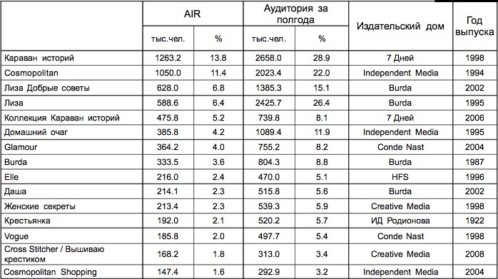 Аудитория женских изданий по данным TNS (декабрь 2009 г. - апрель 2010 г.)