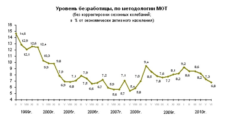 Минтруда США первым из госведомств G8 дает официальную оперативную информацию по уровню занятости. По данным Eurosatat, в июне общая безработица в 16 странах зоны евро и 27 странах ЕС стабилизировалась, оставшись на уровне 10% (15,771 млн человек) и 9,6% (23,062 млн человек) соответственно. Причем максимальная безработица в Европе (20%) оказалась в Латвии, а минимальная (3,9%) — в Австрии. Ранее Росстат сообщал, что общая безработица в России достигла докризисного уровня: в июне она снизилась до 5,206 млн человек (или 6,8% экономически активного населения). Для сравнения: в ноябре 2008 г. Росстат насчитал 5,3 млн безработных (или 7% экономически активного населения).