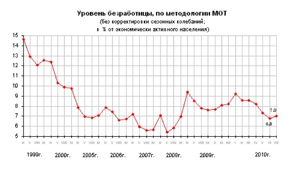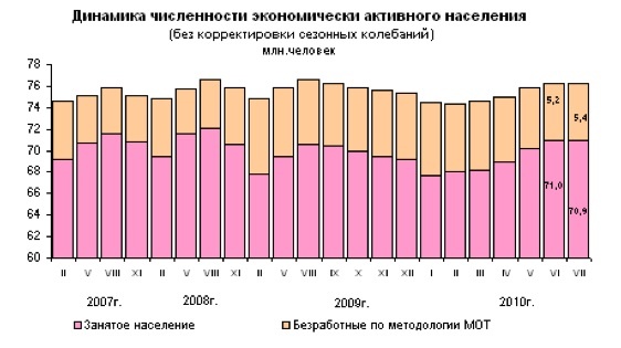 По данным Минздравсоцразвития России, за последнюю неделю численность безработных, официально зарегистрированных в органах службы занятости, снизилась на 0,9% и по состоянию на 18 августа 2010 г. составила 1 748 204 человека. Министерство фиксирует планомерное снижение с 24 февраля (2 286 174 человека).