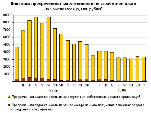 Динамика просроченной задолженности по зарплате с начала 2009 г. (Росстат)