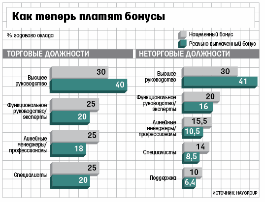 Большинство участников исследования Hay Group используют бонусную систему краткосрочного поощрения как для торговых, так и для неторговых должностей (87 и 92% соответственно). В большинстве случаев размер бонусных выплат привязан как к результатам работы компании в целом, так и к индивидуальным результатам сотрудника. Две трети опрошенных для оценки используют систему ключевых показателей эффективности. Это значит, что перед каждым сотрудником ставятся конкретные цели и размер бонуса зависит от степени их выполнения.