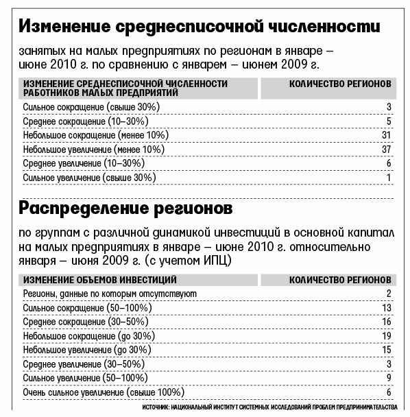 Владимир Буев, вице-президент НИСИПП, в подобных результатах мониторинга видит не только последствия кризиса: «В 2009 г. сектор активно накачивали субсидиями для открытия собственного дела. И число микро- и малых предприятий выросло на 20%, а в 2010 г. они стали лопаться. Я не могу сказать, что программы провалились, но они не работают».