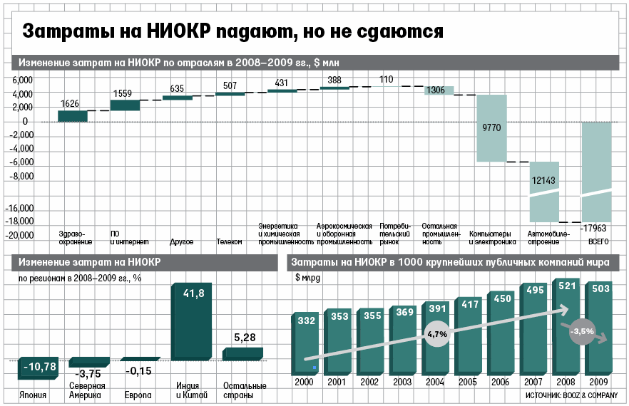 Затраты крупнейших мировых компаний на НИОКР в 2009 г. снизились впервые за все время наблюдений. Но огорчаться рано: четкой связи между объемом затрат на исследования и их результатами консультанты не прослеживаютВ 2009 г. 1000 крупнейших публичных компаний мира потратили на НИОКР $504 млрд, подсчитали консультанты Booz. Это на 3,5% меньше, чем годом ранее. Более того, снижение суммарного объема затрат произошло впервые за все время наблюдений (c 2000 г.). Главная причина снижения – кризис, рассказал Алексей Хохлов, консультант московского офиса Booz. И все же снижение расходов на НИОКР оказалось меньше, чем снижение выручки или снижение административных расходов, утверждает он. По данным Booz, в 2009 г. суммарная выручка компаний, вошедших в эту 1000, снизилась на 8%, а параметр, который консультанты называют интенсивностью НИОКР (рассчитывается как отношение затрат на НИОКР к выручке), возрос с 3,46 до 3,75%. То есть затраты на исследования компании сокращали не в первую очередь: капитальные вложения были сокращены на 17,1%, административные расходы – на 5,4%.