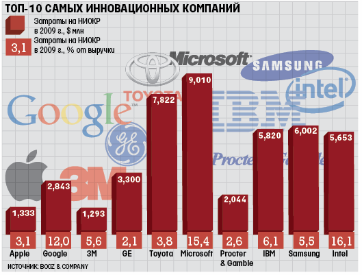 В 2010 г. консультанты Booz дополнительно к основному исследованию провели анкетирование 450 руководителей НИОКР из 400 компаний. Респондентов спрашивали о связи между стратегиями НИОКР, компетенциями, которыми располагает компания, и достигнутыми результатами. Респондентов также попросили назвать три компании, которые они считают самыми инновационными в мире. Результаты мини-опроса еще раз подтвердили вывод: дело совсем не в том, сколько денег компания тратит на НИОКР, а в том, как она их тратит. Первые три места в неформальном списке самых инновационных компаний мира заняли американские Applе (79% голосов), Google (49%) и 3М (20%). Показатели 10 компаний, вошедших в шорт-лист, приведены в таблице. Как обнаружили консультанты, участники этого списка заметно опережают компании с самыми высокими бюджетами на НИОКР по таким финансовым показателям, как темпы роста выручки, темпы роста капитализации и отношение показателя EBITDA к выручке.