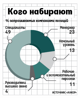 В I квартале 2010 г. общее количество вакансий увеличилось почти на 30% по сравнению с аналогичным периодом предыдущего года, утверждают рекрутеры. С апреля по июнь количество позиций выросло уже на 37%, с июля по сентябрь – на 35% по сравнению с таким же периодом 2009 г., показав небывалый для летнего периода всплеск активности работодателей, на который не повлияла даже аномальная жара, отмечают в «Анкоре». Компании, почувствовав к середине года финансовое облегчение, перешли к развитию новых проектов, полагают рекрутеры. В рейтинге наиболее активных отраслей – FMCG, медицина и фармацевтика, информационные технологии, банки и финансовые услуги, промышленный сектор, а также недвижимость и строительство. Наибольшим спросом, по данным «Анкора», пользовался персонал среднего звена – специалисты и менеджеры (чуть больше 70%, см. графики).