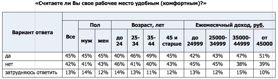 Удобным свое нынешнее рабочее место чаще считают опрошенные в возрасте от 35 до 45 лет (49%), а также респонденты с ежемесячным доходом от 45 000 руб. (51%). Не могут назвать свое рабочее место комфортным 42% имеющих работу россиян. Женщин среди них несколько больше, чем мужчин (43% против 41%). Неудобным свое рабочее место чаще называют молодые сотрудники до 24 лет (46%), а также россияне, зарабатывающие до 35 000 руб. в месяц (45%).