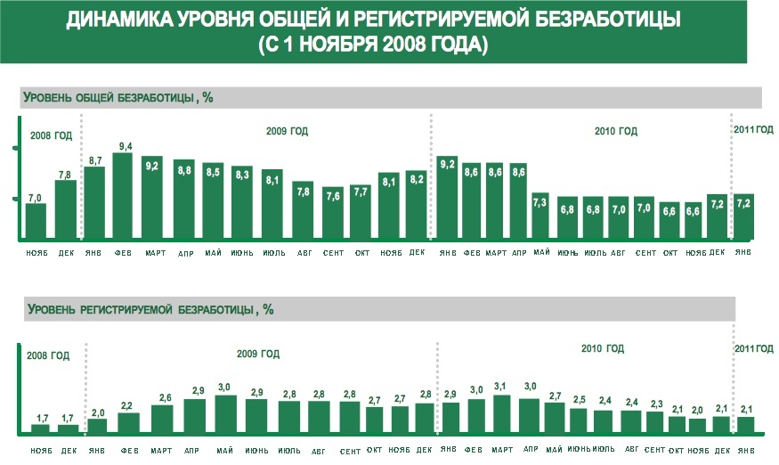 В январе 2011 г. общая безработица в России выросла на 1,1% до 5,7 млн безработных и составила 7,6% экономически активного населения, утверждает Росстат. Безработица растет с ноября 2010 г., когда ведомство насчитало 5 млн безработных.