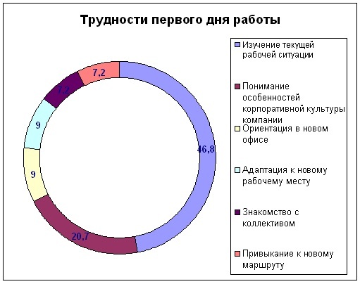 Опрос показал, что самым трудным для новичков оказывается изучение текущей рабочей ситуации (46,8%), на втором месте – понимание особенностей корпоративной культуры (20,7%), третье место разделили факторы ориентации в новом офисе и адаптация к рабочему месту (по 9% голосов), а наименее дискомфортными соискатели посчитали знакомство с коллективом и привыкание к новому маршруту – по 7,2% (см. диаграмму).