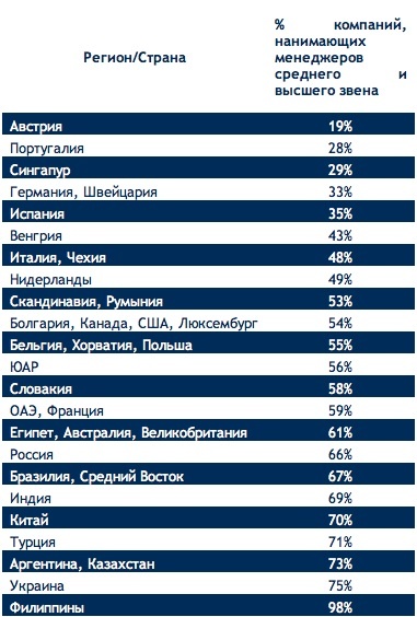Россия находится на седьмом месте в мире и на втором (после Украины) у Европе по активности найма менеджеров среднего и высшего звена, утверждают исследователи международной рекрутинговой компании Antal International, опросив в мае-июне 2011 г. представителей 12 800 крупных компаний 47 стран мира (в России в опросе приняли участие 300 предприятий).