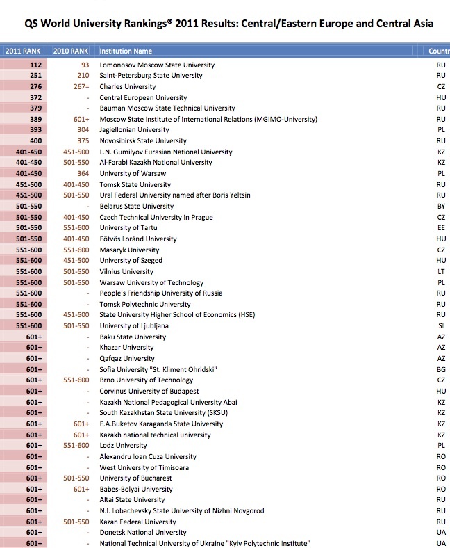 Университеты Центральной Азии и Центральной и Восточной Европы в QS World University Rankings 2011