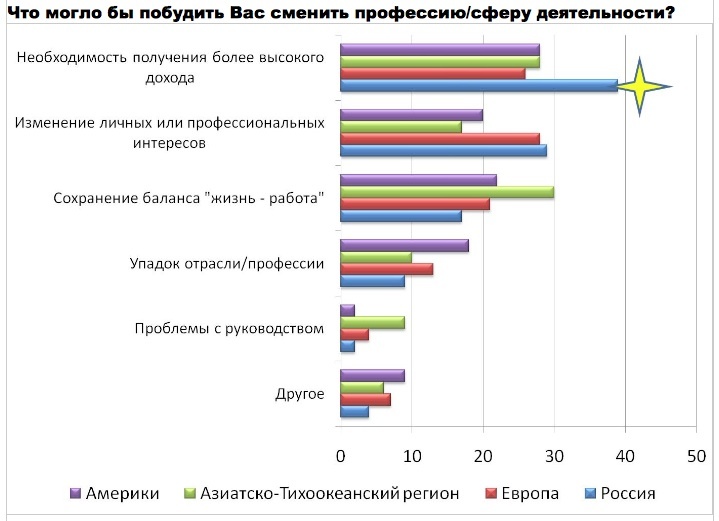 Главной причиной для радикальных перемен в своей карьере россияне считают потребность в большем доходе – 39%. В своем стремлении зарабатывать больше респонденты в России уверенно опережают респондентов всех остальных стран (см. диаграмму № 1). На втором месте – изменение личных или профессиональных интересов – 29%. Сохранение баланса между трудовой и личной жизнью актуально для 17%. Бесперспективность работы в выбранной профессии/отрасли может подвигнуть на перемены 9%. Еще 2% задумываются о смене карьерного направления из-за проблем в отношениях с руководством.