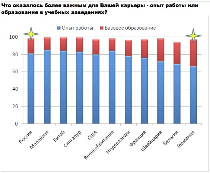 Что роднит россиян и американцев - так это оценка значения профессионального опыта в строительстве карьеры: в России собственный опыт работы ценят превыше всего 81% респондентов, и только 17% считают более важным фактором образование (см. диаграмму № 2),