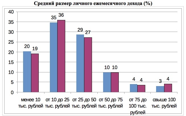Доходы фрилансеров существенно различаются, и в основном сумма составляет от 10 000 до 25 000 руб. в месяц. По сравнению с 2008 г. значимых изменений в среднемесячных доходов фрилансеров не произошло.